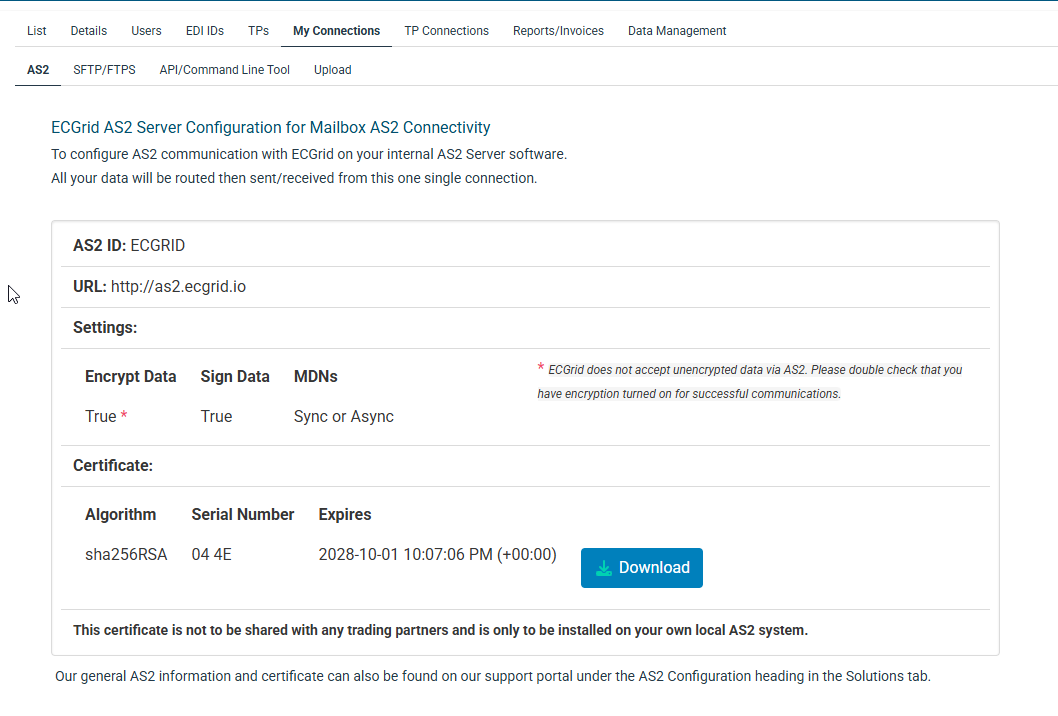 *Please note: If the ECGrid certificate that you are connecting to is expiring within the next 90 days, you can download the new one from this page. Our certificate renewal technology runs the new certificate in parallel with the current certificate, allowing you to update the certificate at your convenience. Once you upload the new ECGrid certificate, you must send a test or a file signing with the new certificate. This notifies our network that you have successfully uploaded the new certificate and we automatically switch your profile to the new certificate on our end.