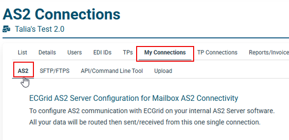 - Under the "AS2" tab, you can find information on ECGrid’s default AS2 profile and information on the top half of the page to configure on your software