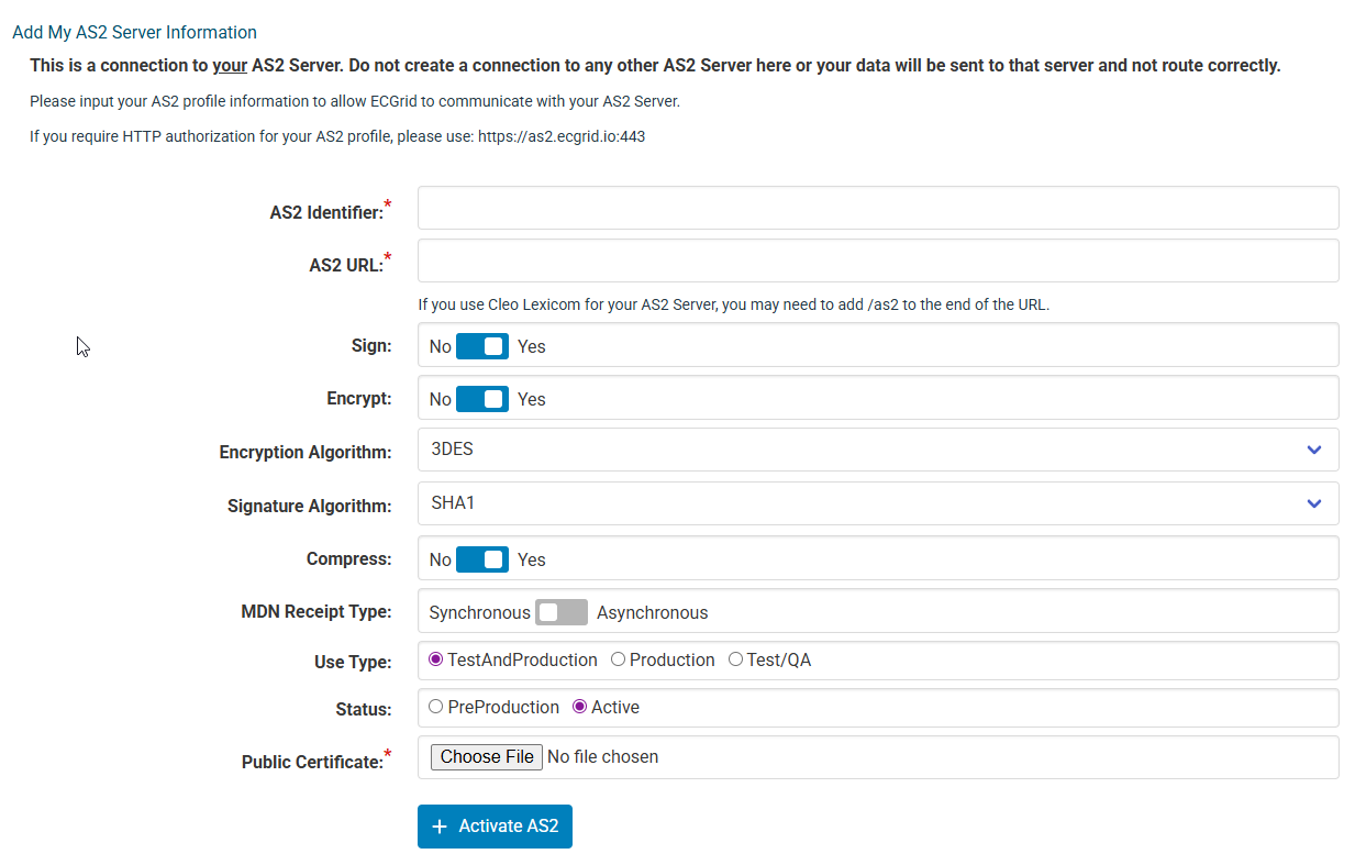 Setting up an AS2 connection to ECGrid can be easily done via your ECGRID Portal.