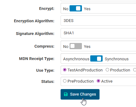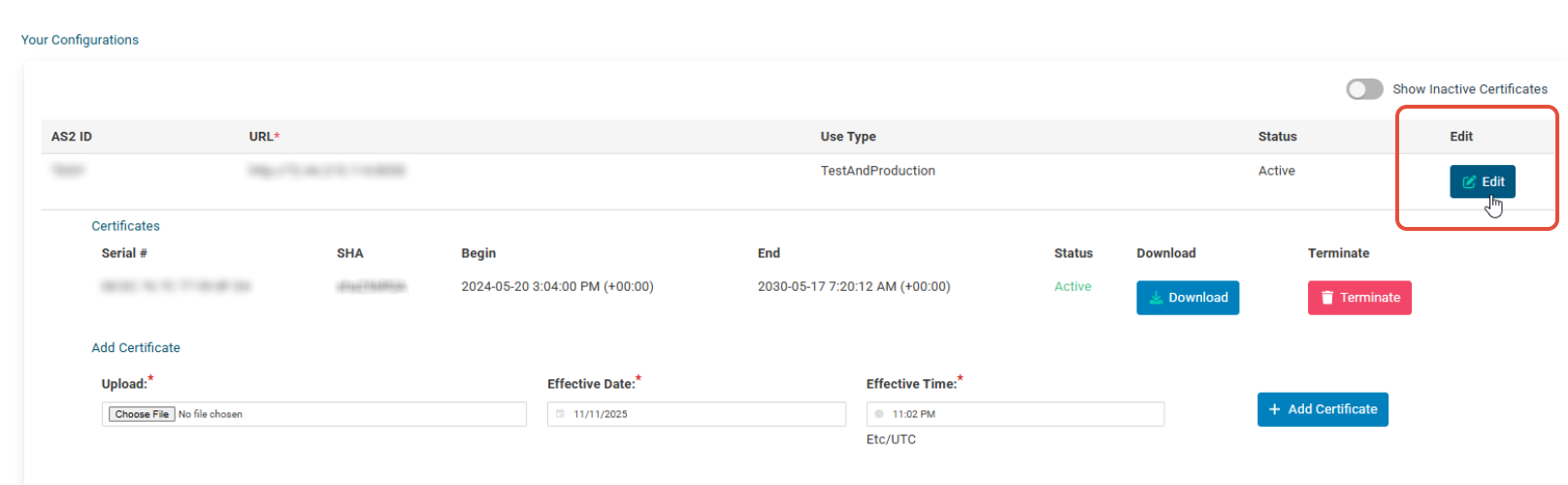 To Edit your AS2 ID, URL, or other parameters, simply select "Edit" on the right-hand side of your AS2 configuration and "Save Changes" when done: