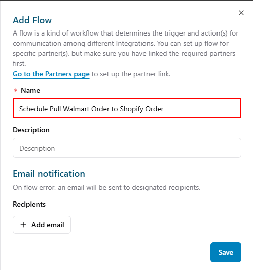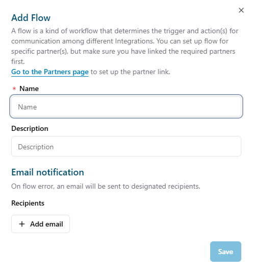 Add Email: When a flow error occurs, an email will be sent to the designated recipients.- In the Name field: Enter the name you want to create.