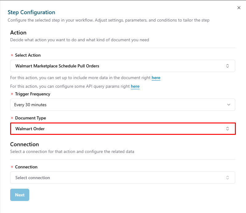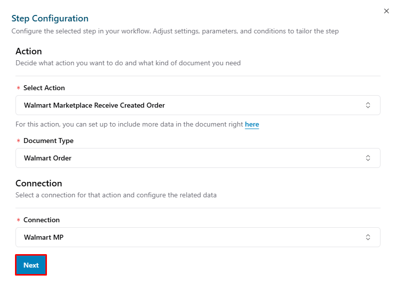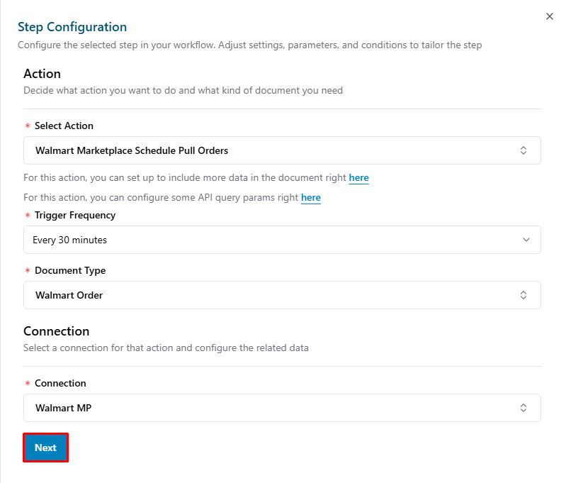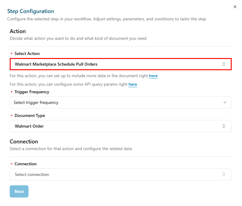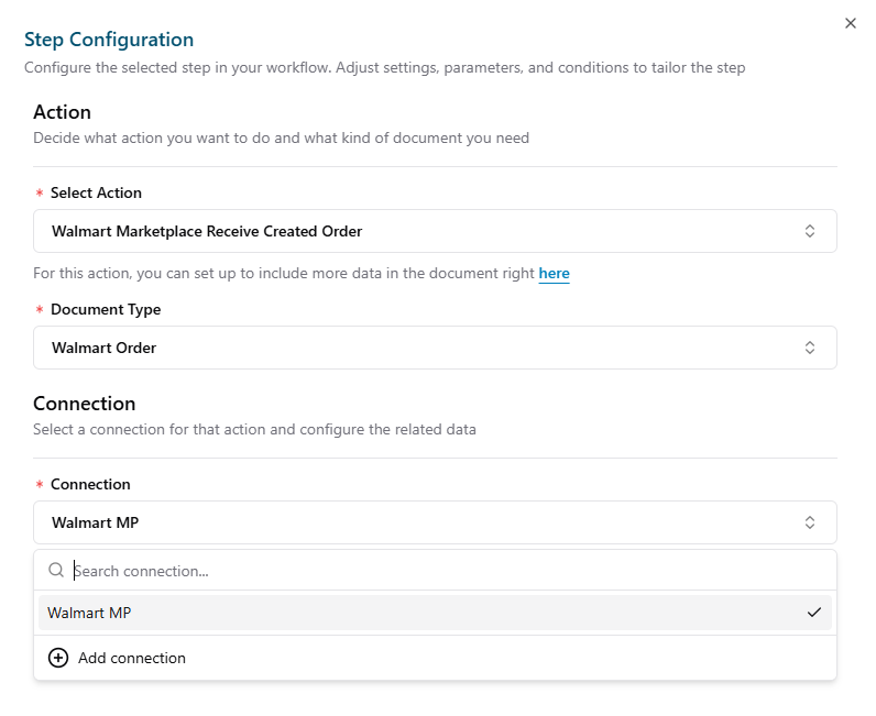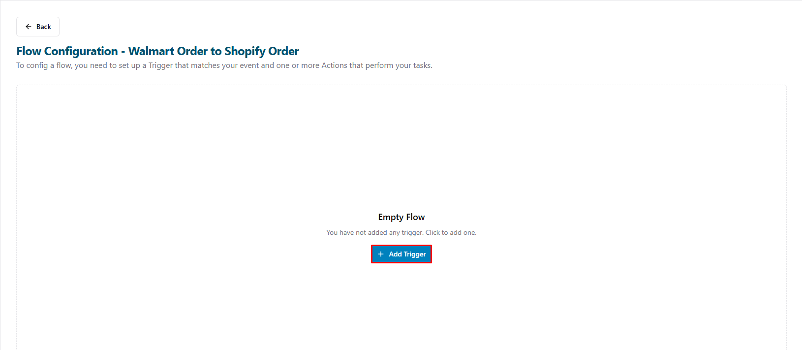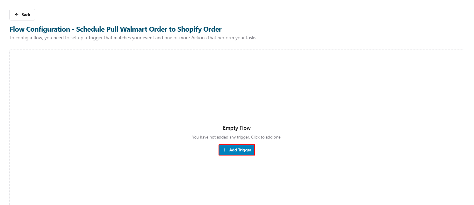 Note: This guide covers the basic steps to create a Flow Configuration for Walmart Marketplace. For more detailed information, please refer to the following article Setup a Basic Flow.- Add a new trigger: Click Add Trigger button.