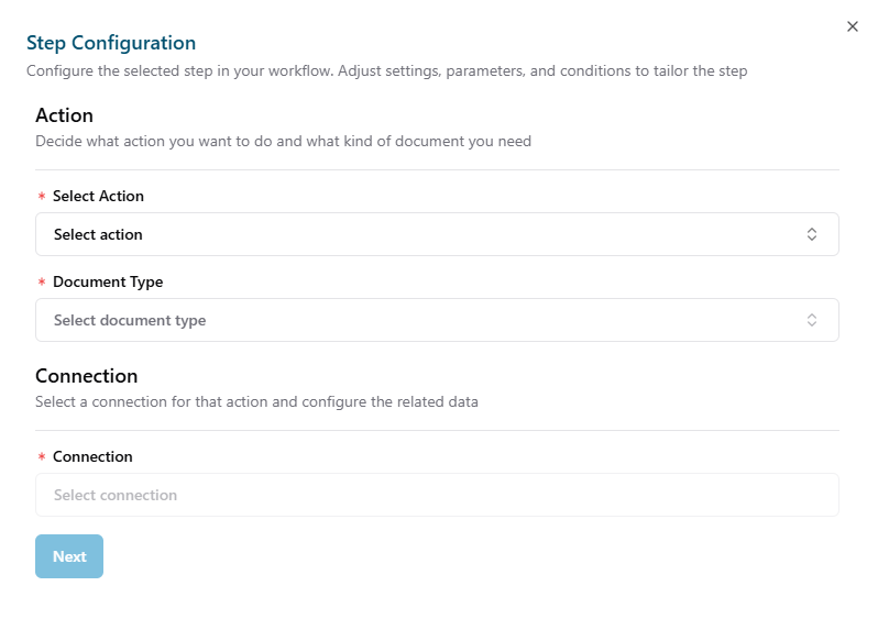 - Some actions are linked to specific document types, so the Document Type will be populated automatically when the action is selected.