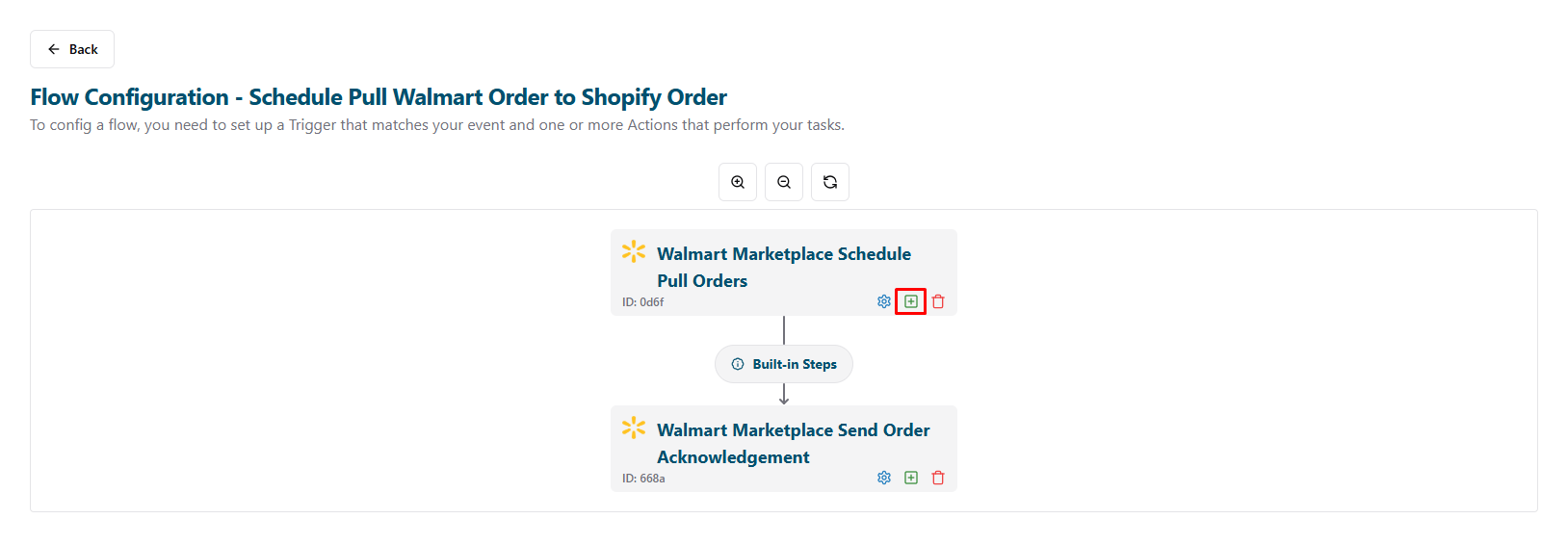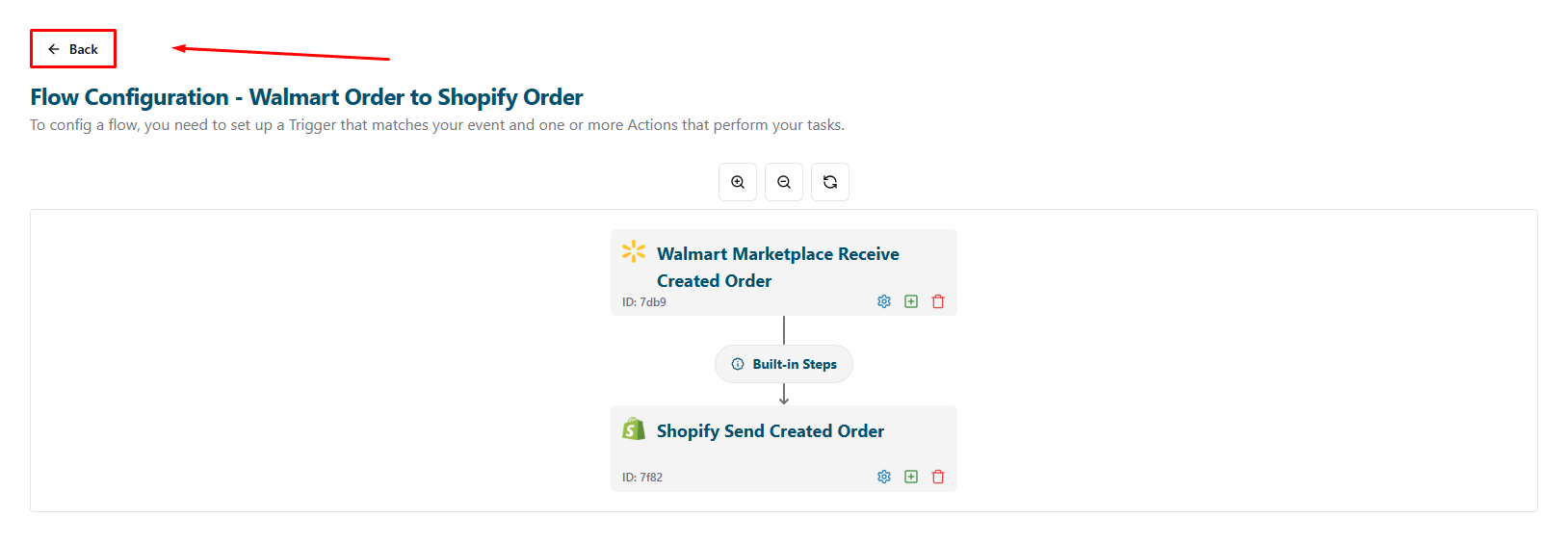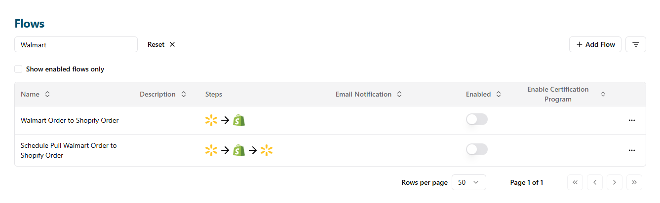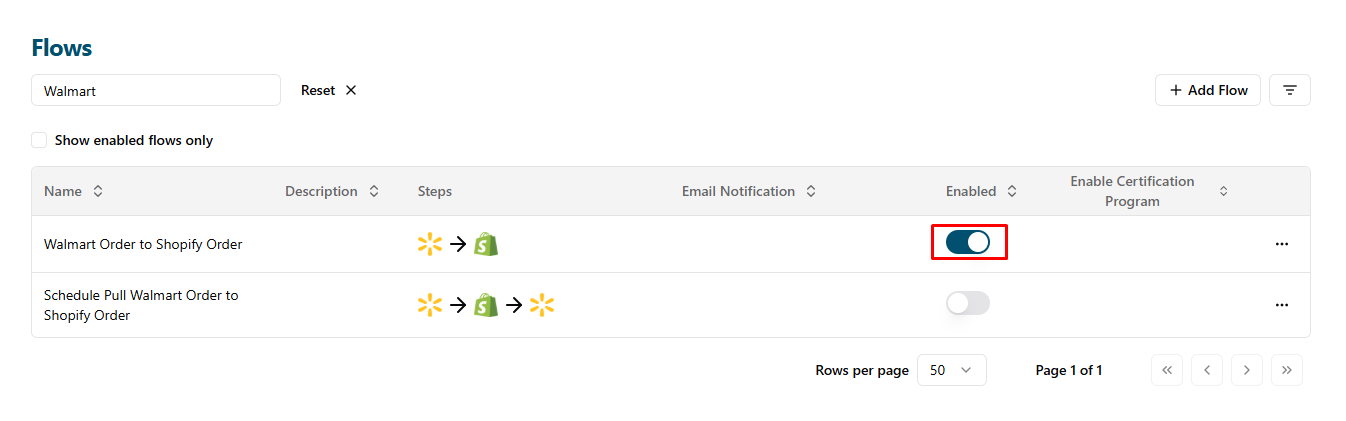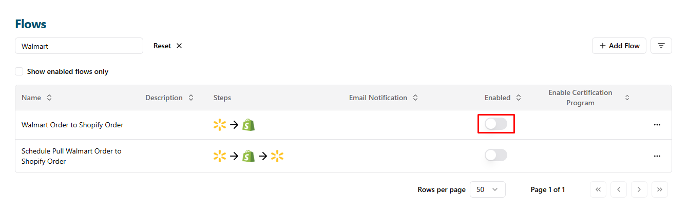 - After setting up the flow for Walmart Marketplace, return to the Flows page to enable the new flow: Click the Back button.