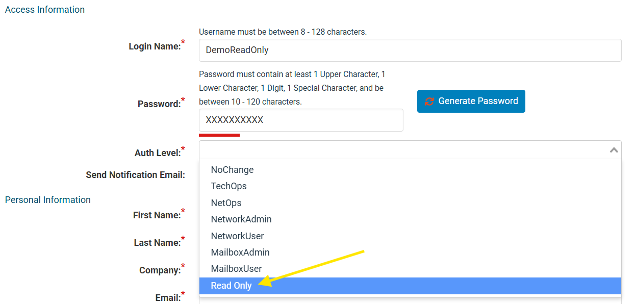 When creating a new user, use the Auth Level dropdown to choose "Read Only":