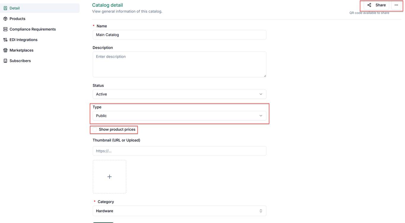3. Set the visibility: Public (discoverable by other users on the GPA network) or Private (not searchable). Note that product prices are hidden by default on public catalogs — the "Show product prices" option is unchecked unless you explicitly enable it.