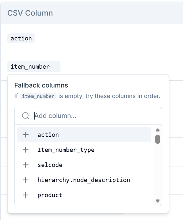 5. To set a fallback source field, click the CSV field name and select a secondary option. For example: use Short Marketing Description as the primary source, and fall back to Extended Marketing Description if the primary field is empty.