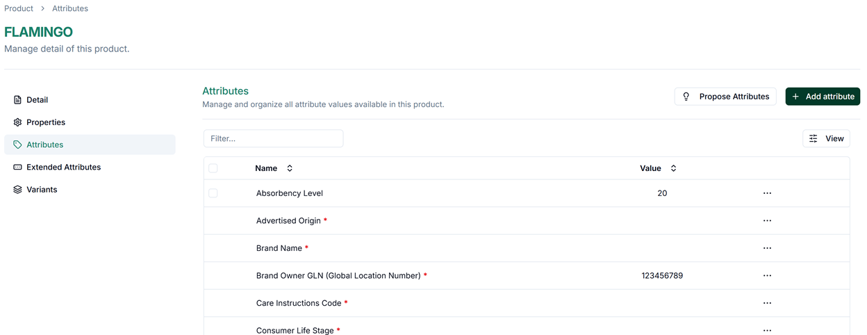 Attributes allow you to capture additional product information beyond the standard fields — such as material, dimensions, certifications, or any other data relevant to your trading partners. There are two types of attributes in Global Product Access.