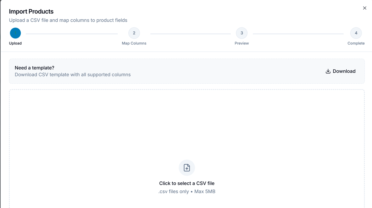 1. Navigate to Products and click Import to open the CSV Import Wizard.