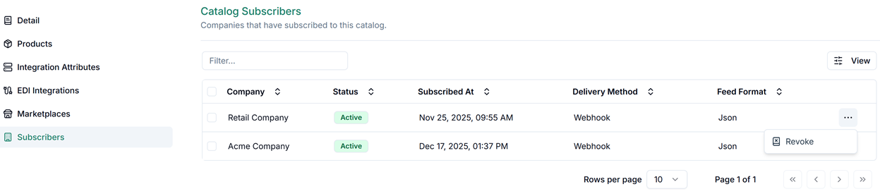 The Subscribers section within each catalog lists all companies that currently have an active subscription to that catalog through the GPA network. You can revoke any company's access at any time from this section — access is removed immediately upon revocation.