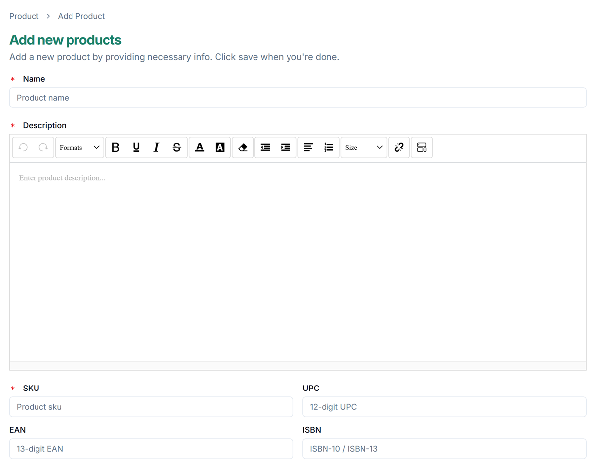 2. Fill in the primary product information (name, SKU, description, etc.) and click Save .