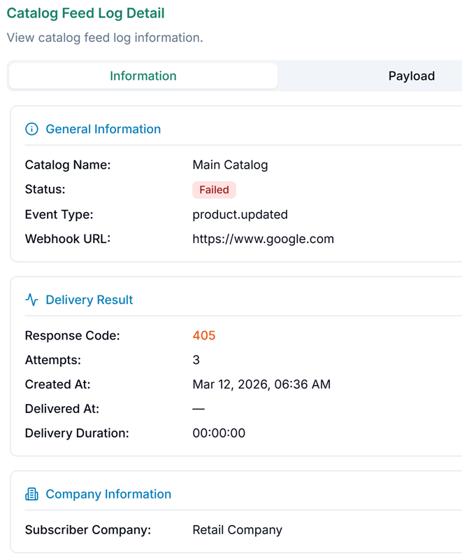 The Catalog Feed Logs section provides a complete history of all data sent to each of your catalog subscribers. It includes both successful deliveries and any errors that occurred during the process.