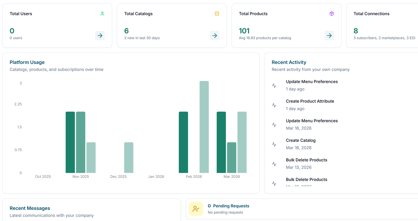After logging in, you will land on your Dashboard. The dashboard displays summary widgets giving you a quick view of your catalog activity, subscriber counts, recent messages, and sync status. The main navigation menu on the left provides access to all platform features.