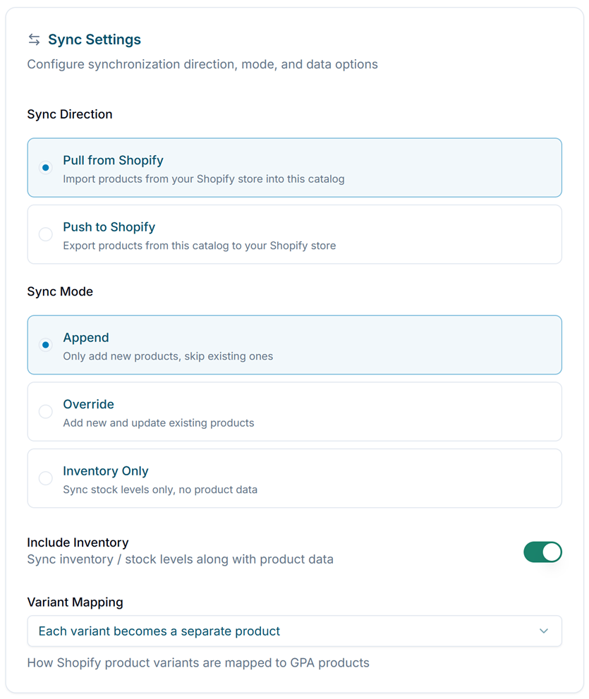 Connect your catalog to major marketplaces — including Shopify, Walmart, and Amazon — to push product information and inventory directly to those platforms or pull updates back into Global Product Access.