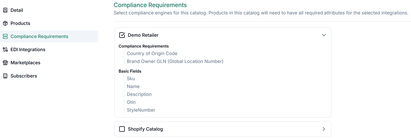 Compliance engines are configured by your system administrator and define which product attributes are required for specific retailers or marketplaces (for example, Shopify, Walmart, or Amazon). Conditional requirements are supported, meaning a field may only be required when certain other conditions are met.