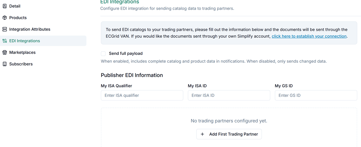 The EDI Integrations section allows you to send 832 (Price/Sales Catalog) and PRICAT EDI documents directly to retailers as required by your trading relationships. Access this section from within the catalog detail view.