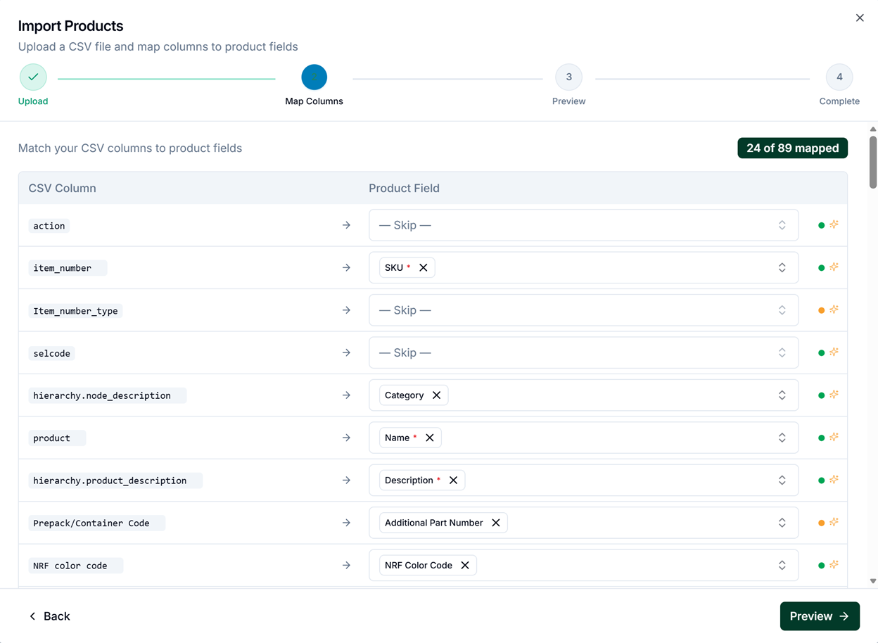 2. Upload your CSV file. The wizard uses AI to automatically map your column headers to the corresponding Global Product Access fields.
