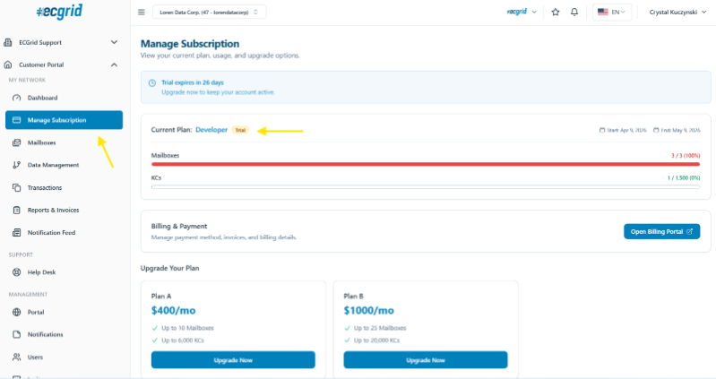 Your Developer program allows you to upgrade your tier through self-service. Go to your Manage Subscription tab on your left side navigation panel. From there, you will see your current tier, your tier allowances, and options to upgrade.
