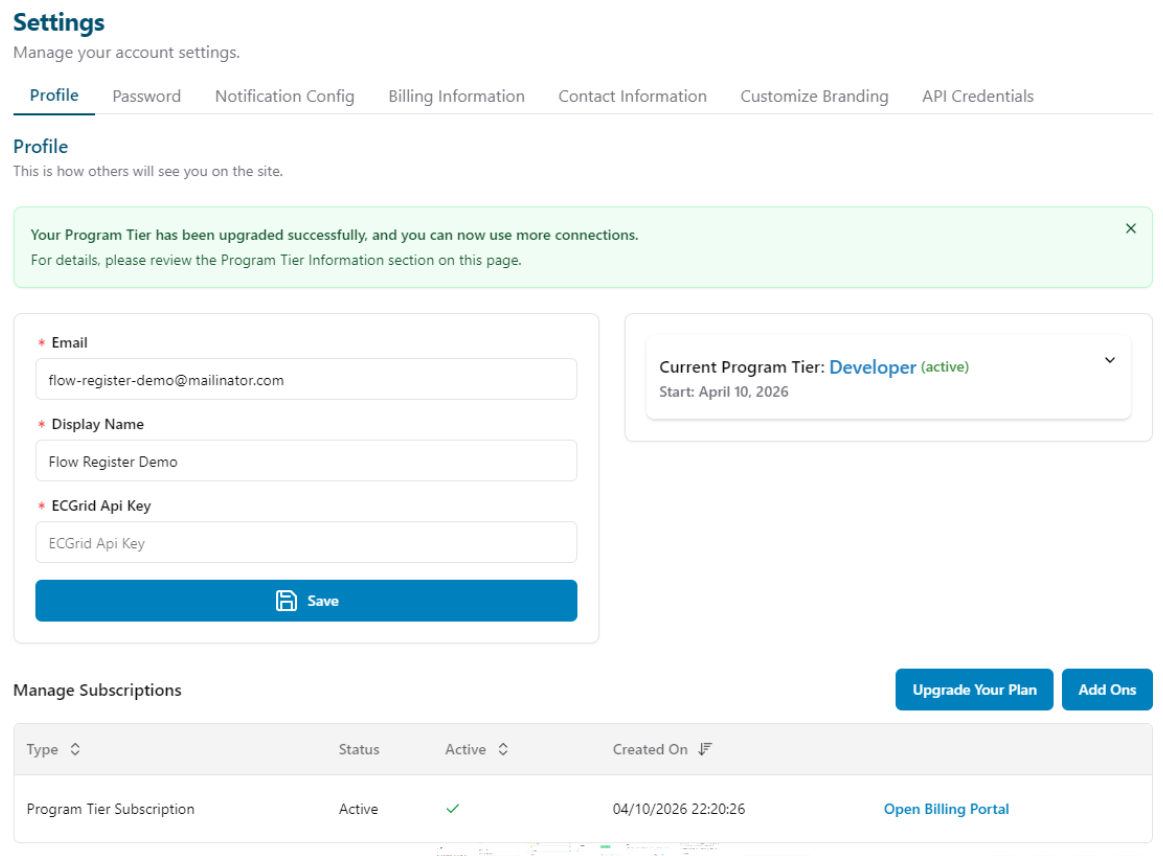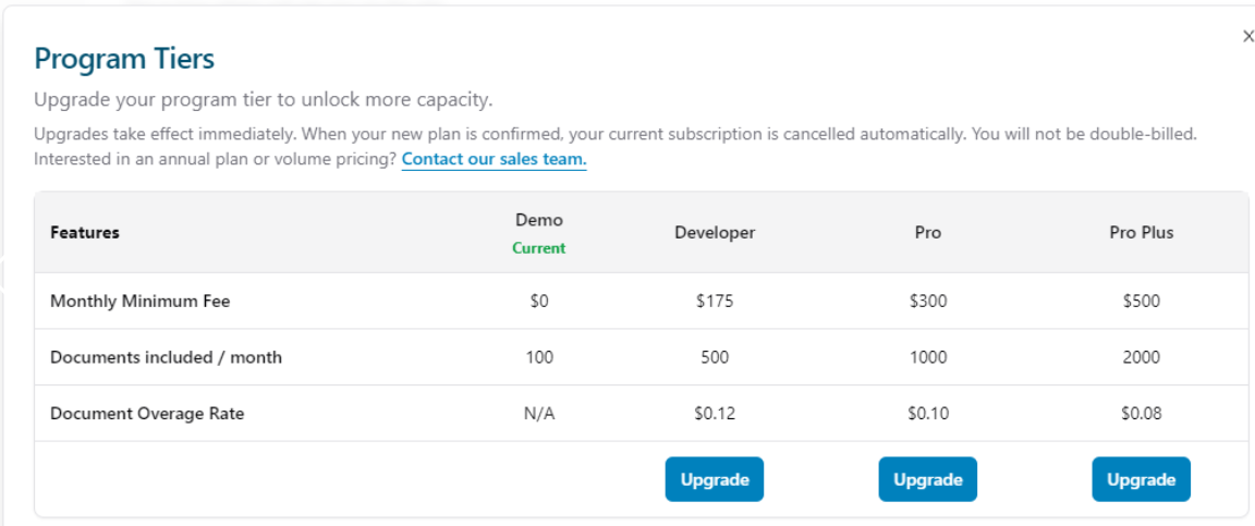 Your Developer program allows you to upgrade your tier through self-service. Go to your Manage Subscription tab on your Profile in the upper right hand corner of your portal page. From there, you will see your current tier, your tier allowances, and options to upgrade.